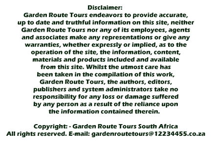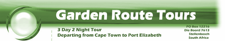 This year (2006) Garden Route Tours is celebrating 11 years of touring the Garden Route. Garden Route Tours is privately owned, (Mr. Gerald Crawford) and have a proven track record that has made Garden Route Tours a highly successful company with offices in Stellenbosch. Garden Route Tours continue to make significant investments in developing our business and enhancing services to our customers. All our tours are conducted by professional - tour guides - and/or couriers or drivers, in air-conditioned touring cars, coaches and minibuses.