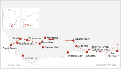 We will depart at 08:00 towards Paarl on the N1, we will continue over the Drakenstein Mountains to Worcester where you visit Kleinplasie, a living open-air museum depicting the lives of the early settlers. After tee we will continue via Montagu for lunch then onto Carlitzdorp to Oudtshoorn in the Little Karoo. We will arrive in time for a visit to Ostrich Show Farm. Overnight in Oudtshoorn. We will have dinner at a restaurant in Oudtshoorn.